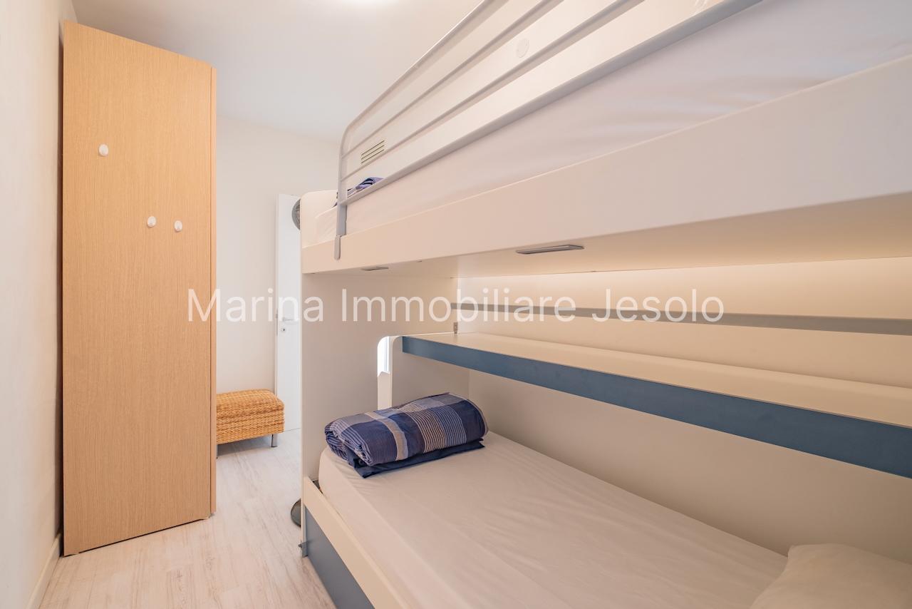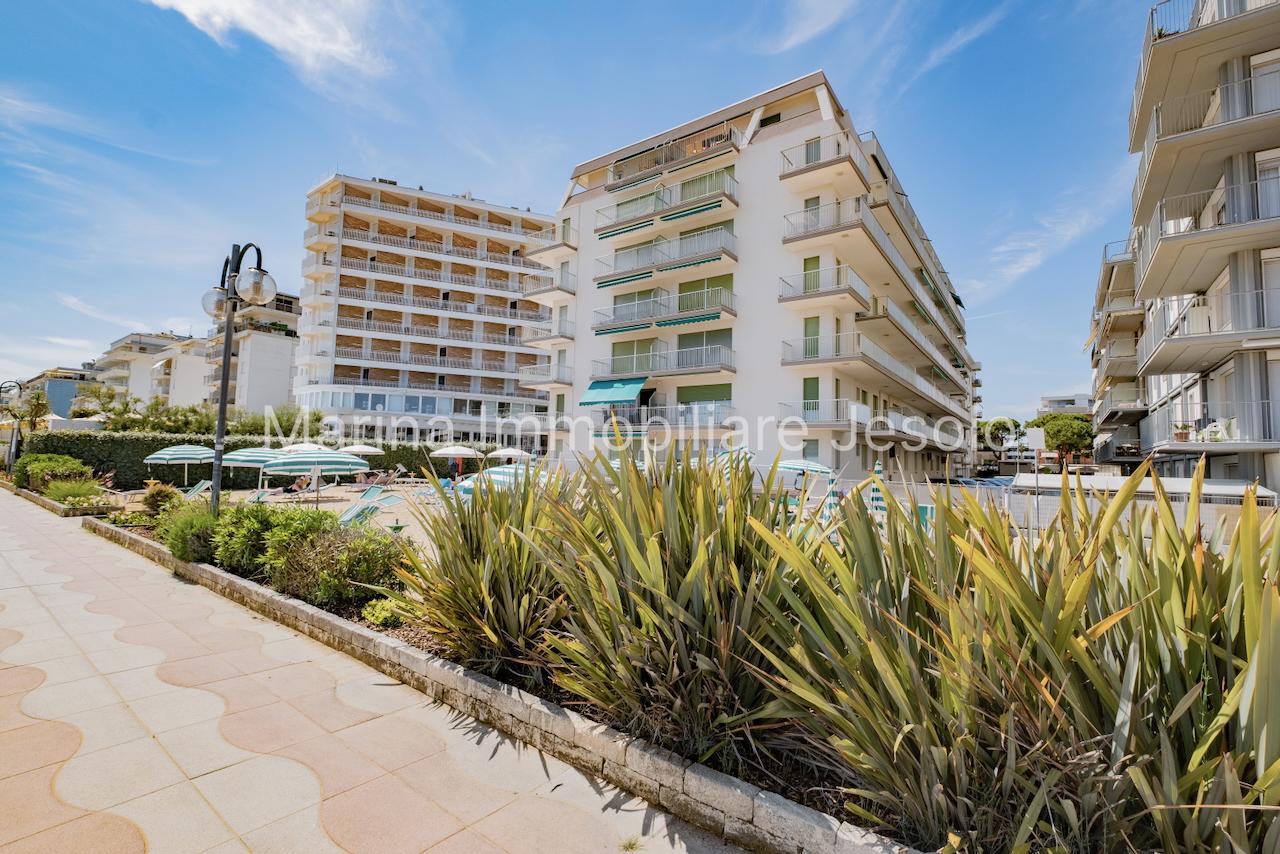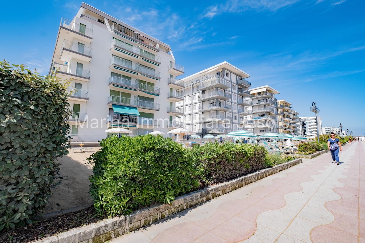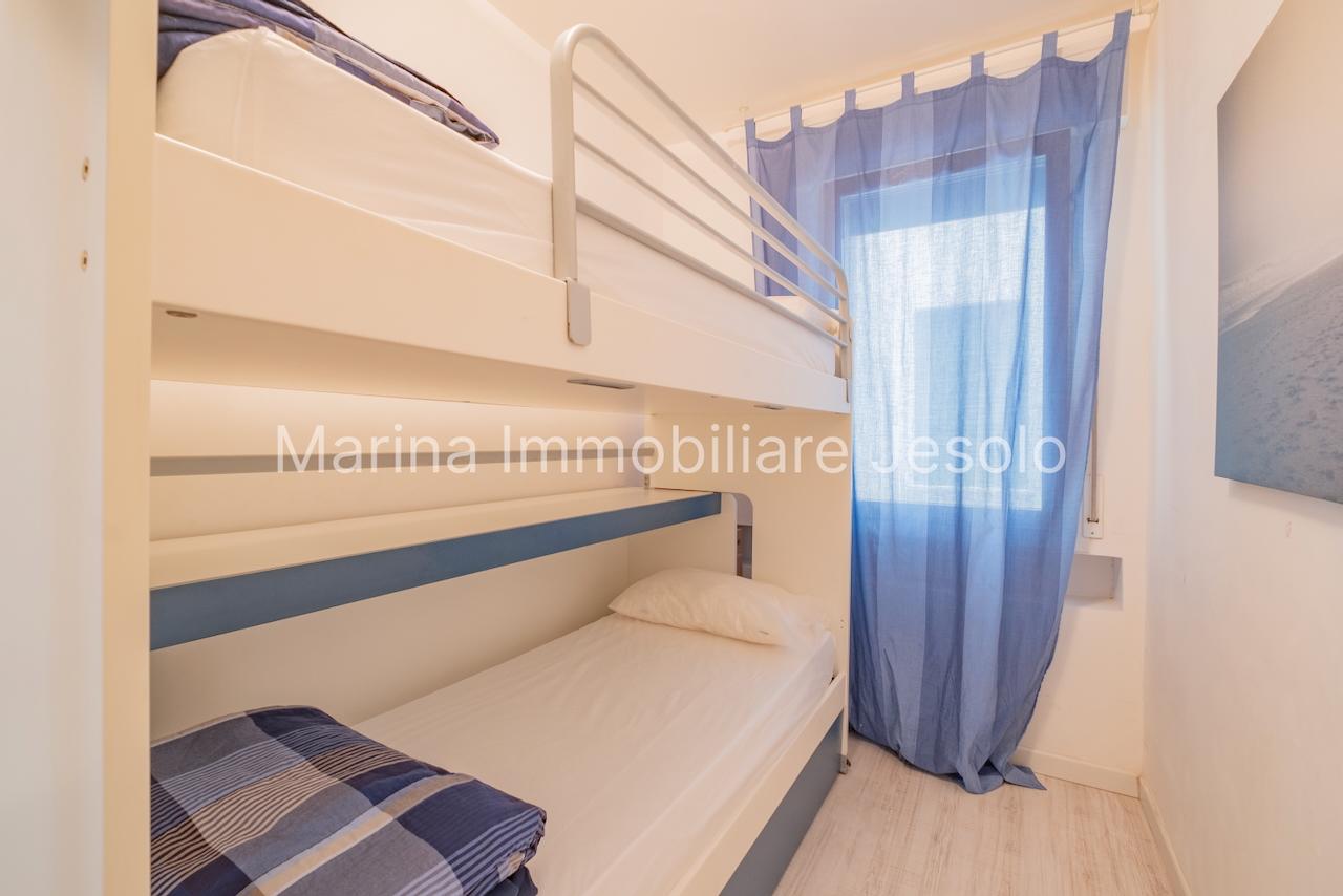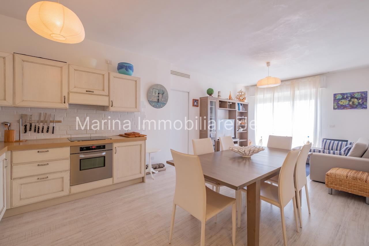 Appartamento laterale frontemare, tra Piazza Nember e Faro. L'appartamento, al 3° piano con ascensore è composto da soggiorno con angolo cottura, camera matrimoniale, camera con letto a castello e terzo letto, bagno con box doccia, lavatrice, terrazzo laterale vista mare e aria condizionata N.1 posto auto e posto spiaggia inclusi. Totale posti letto: 5