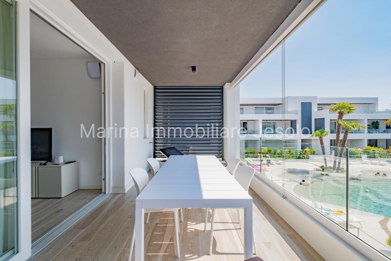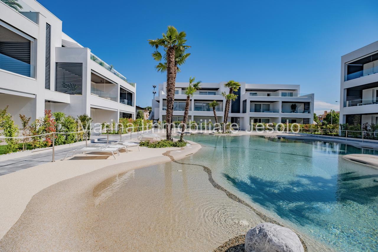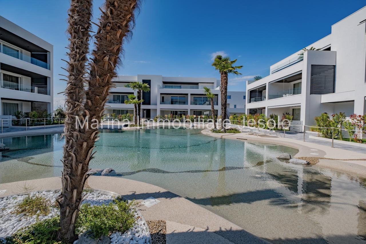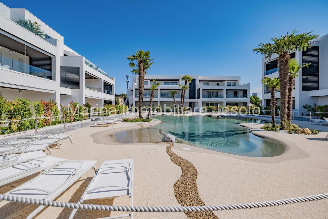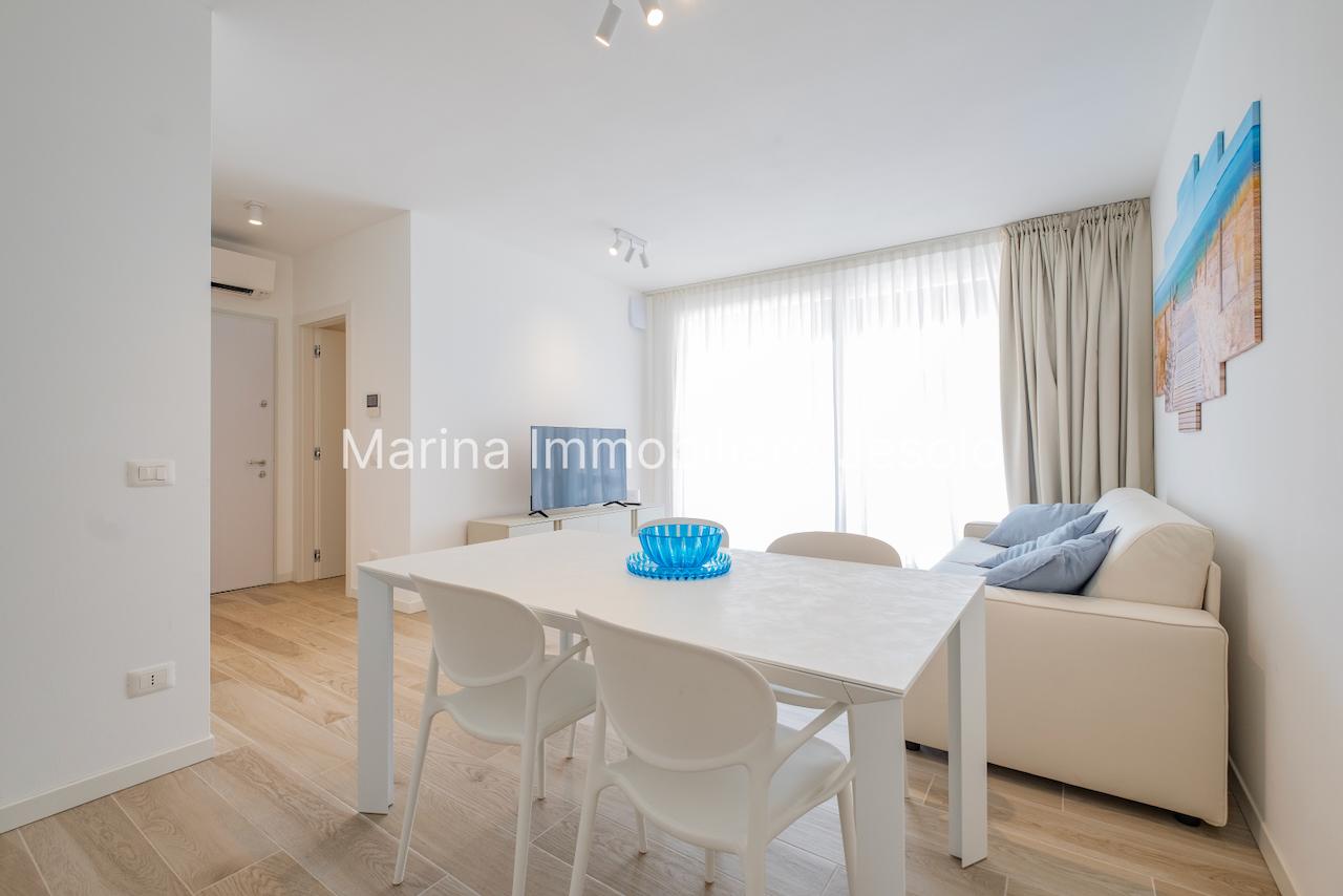 Residence di nuovissima costruzione in zona centrale tra Piazza Aurora - Marina con piscina. Appartamento al 1° piano con ascensore, dotato di tutti i comfort, così composto: angolo cottura e soggiorno, n. 1 camera matrimoniale, n. 1 camera doppia, n. 2 bagni, ampio terrazzo fronte piscina e balcone, posto auto. Totale posti letto 4+2 Posto spiaggia prenotabile presso il consorzio di zona a prezzo extra Non affittabile a gruppi di ragazzi