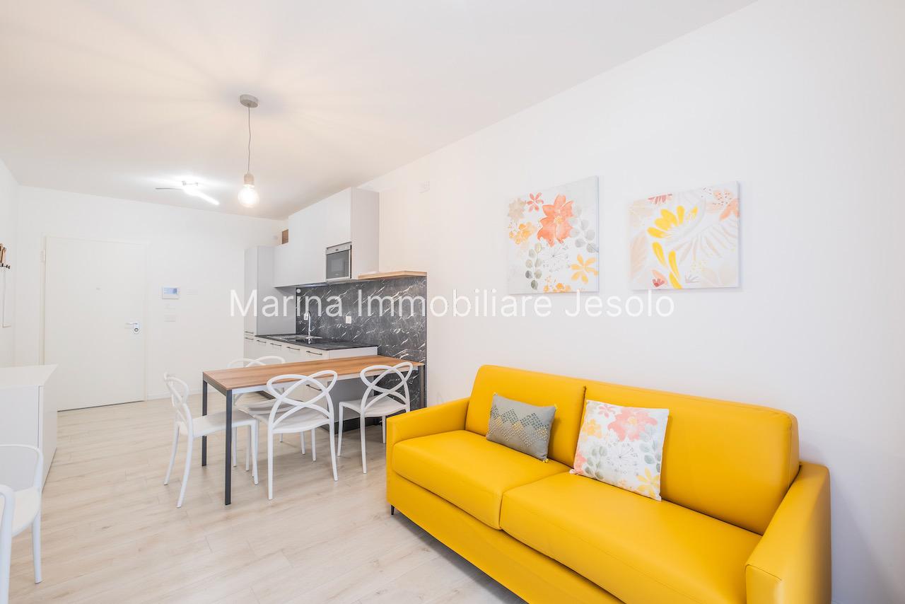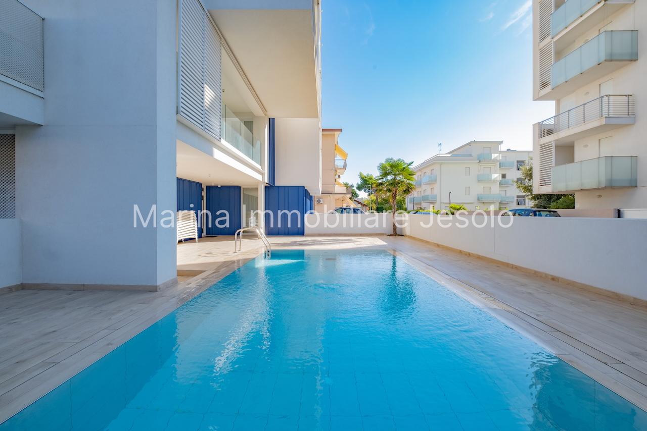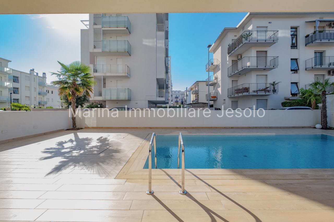 New residence with swimming pool, only 250 meters from the beach, near Marina Square. Ground floor apartment composed of: living room with double sofa bed, kitchenette, bedroom with double bed, bedroom with two single beds, bathroom, small garden. Washing machine, dishwasher, TV, air conditioning, WIFI. N. 1 Parking place is included. N. 1 Beach place is included. Total bed places: 4+2 Rentable only to families.