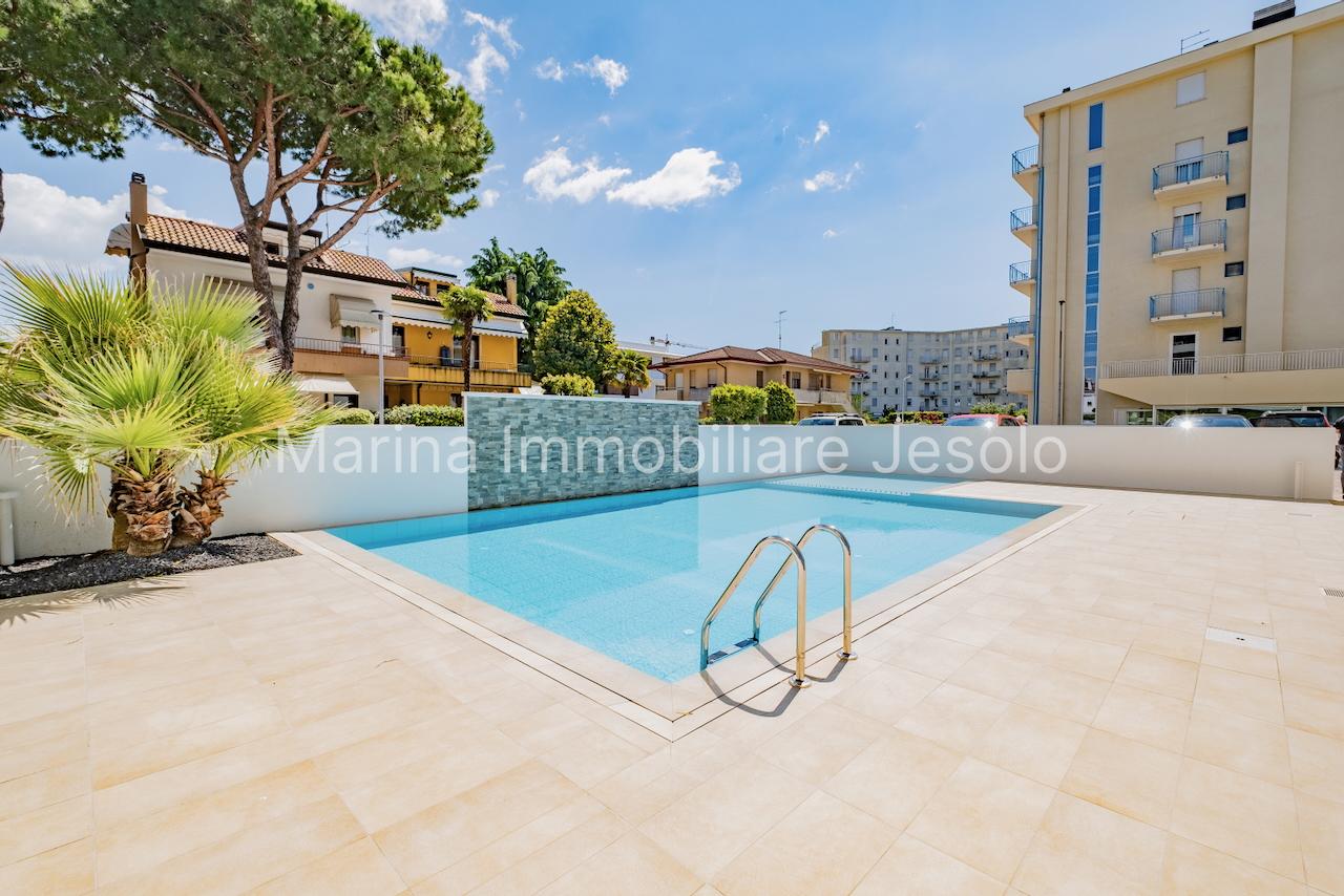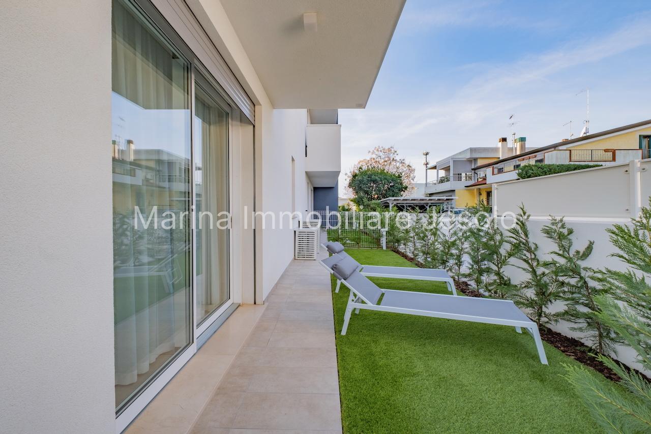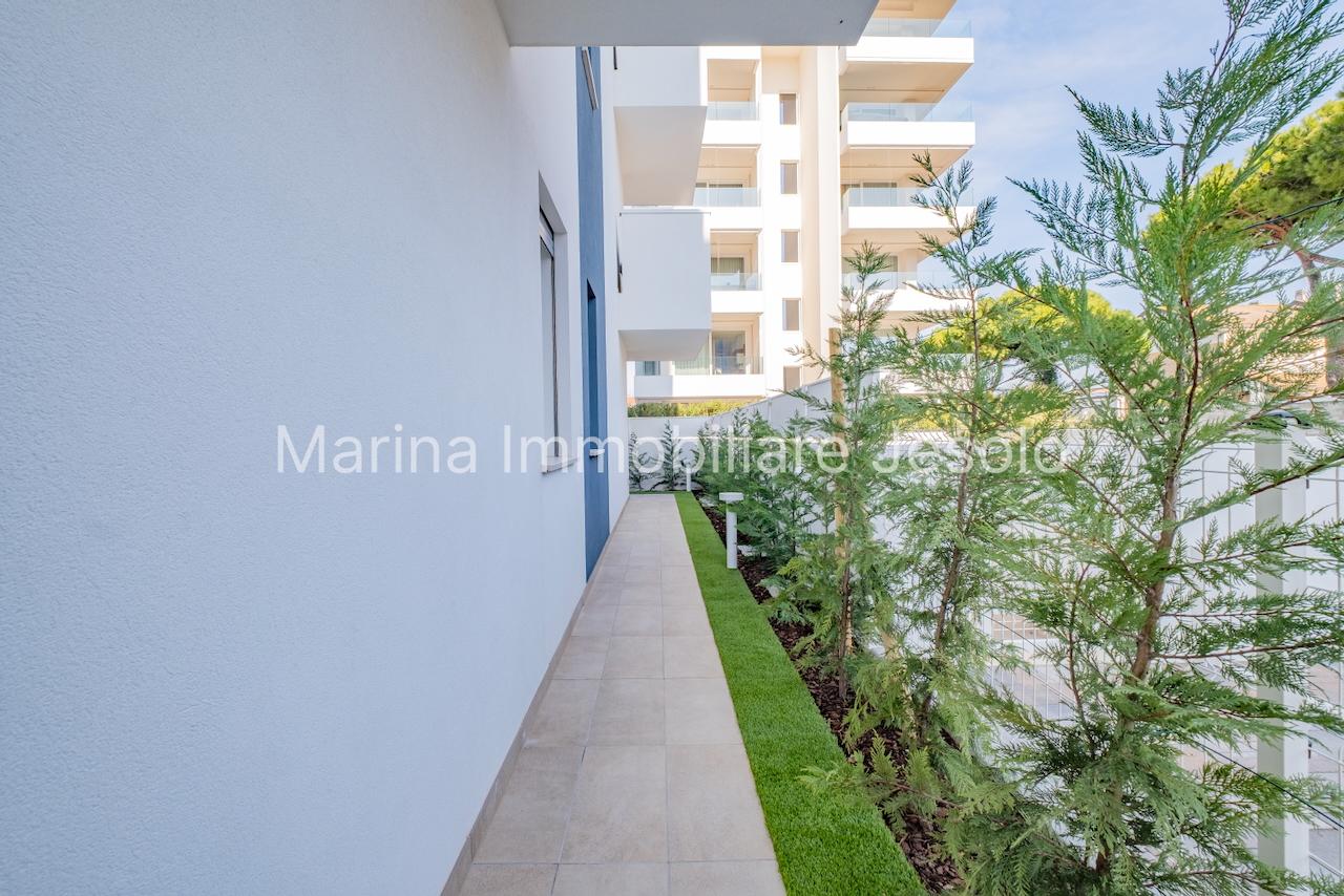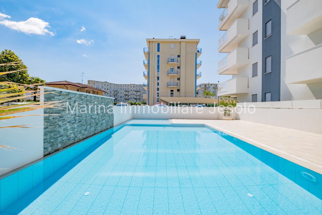 New residence with swimming pool near Aurora Square, 250 meters from the beach. Ground floor apartment with patio and private garden, consisting of: kitchenette and living room with double sofa bed, n. 1 double bedroom, n. 1 twin bedroom, n. 2 bathrooms.