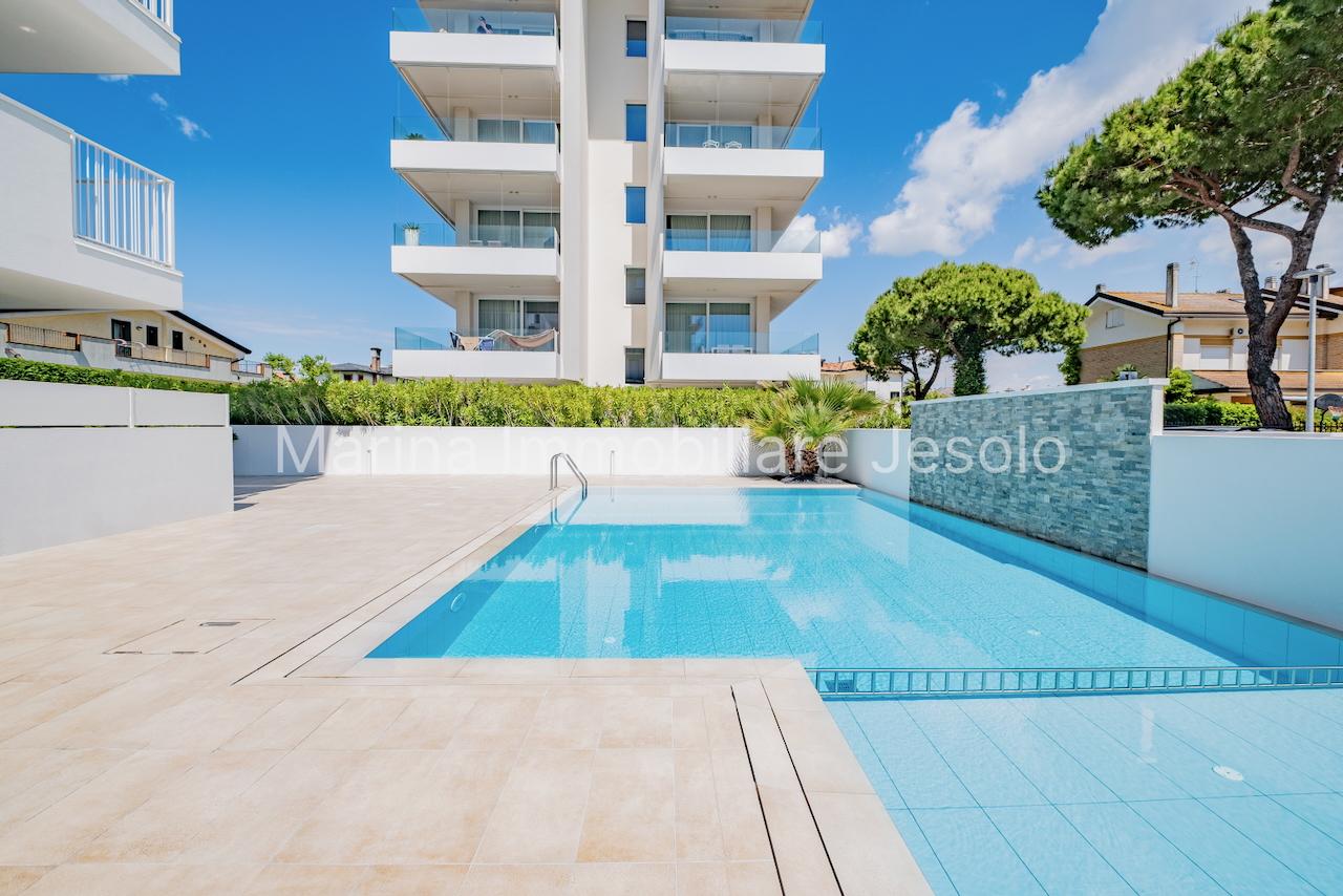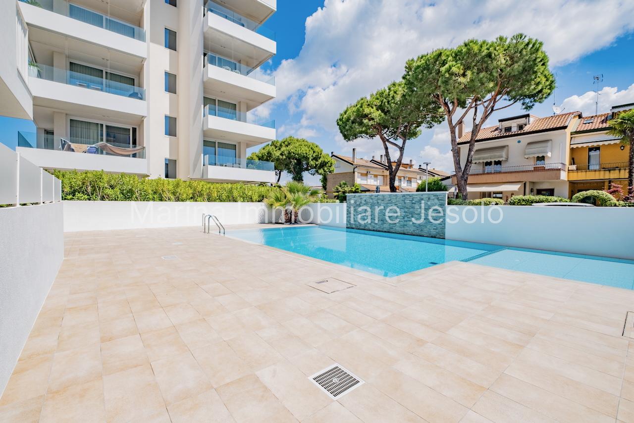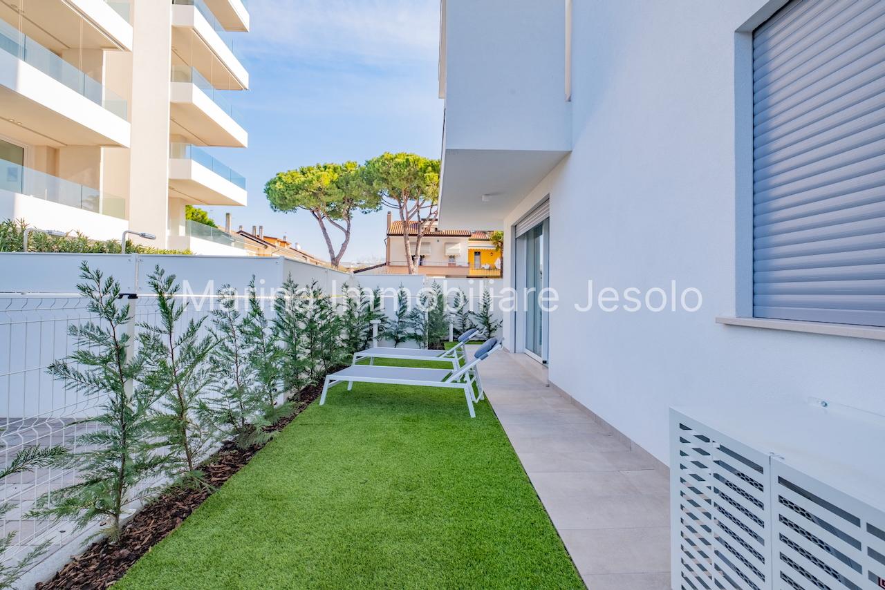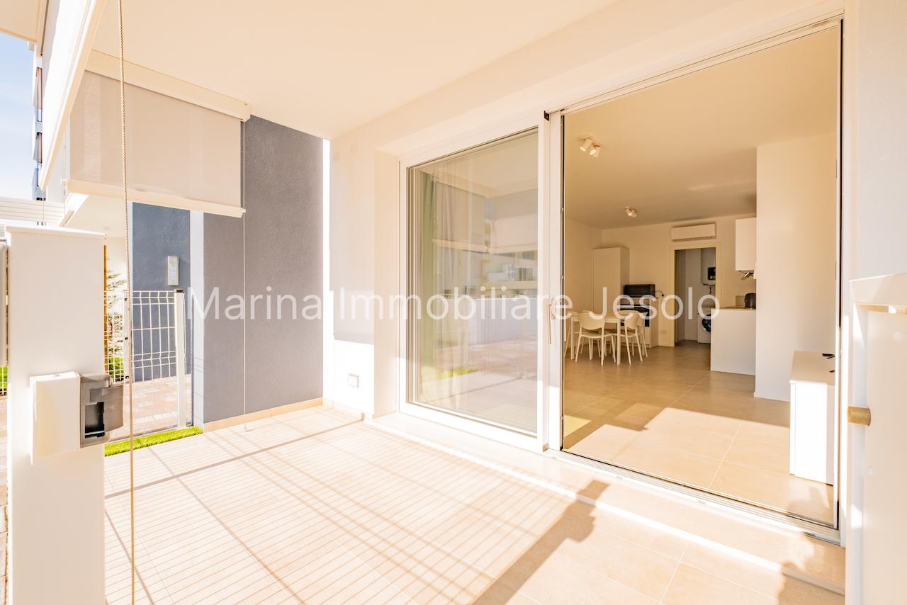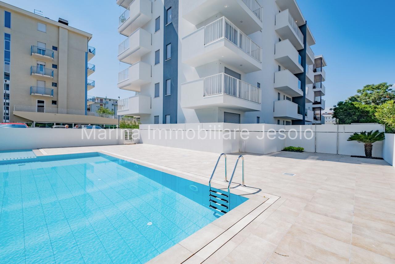 New residence with swimming pool near Aurora Square, 250 meters from the beach. Ground floor apartment with patio and private garden, consisting of: kitchenette and living room with double sofa bed, n. 1 double bedroom, n. 1 twin bedroom, n. 2 bathrooms.