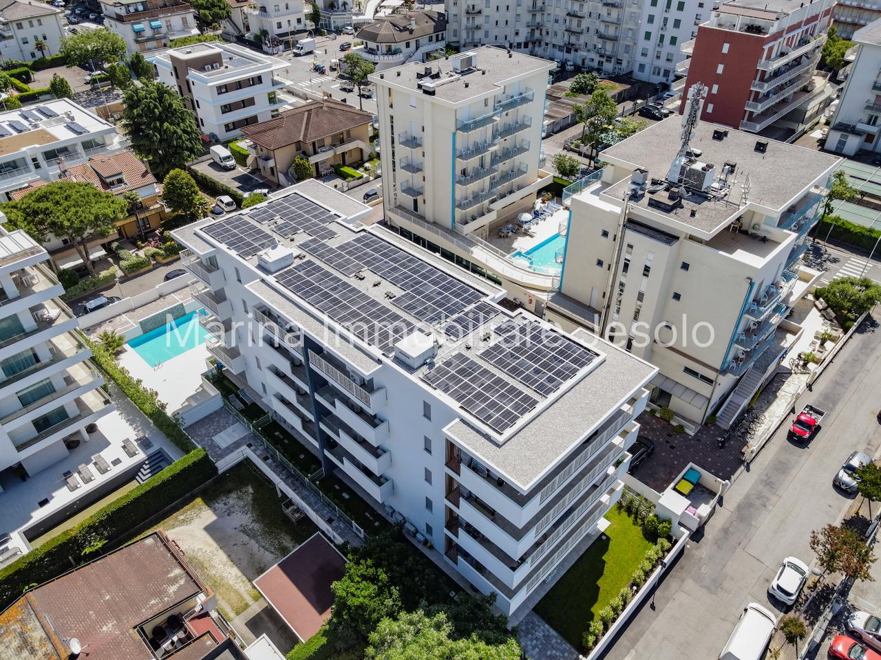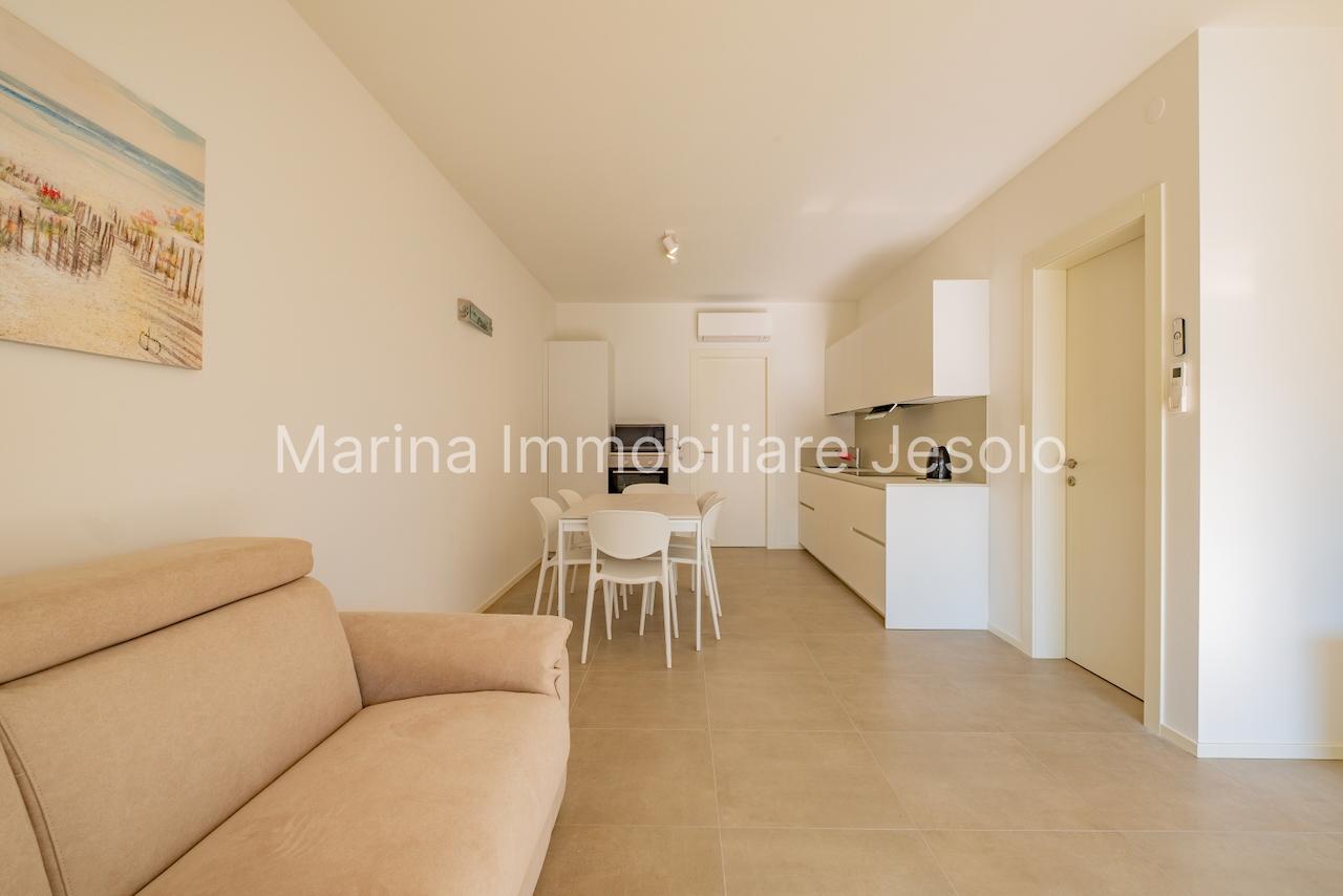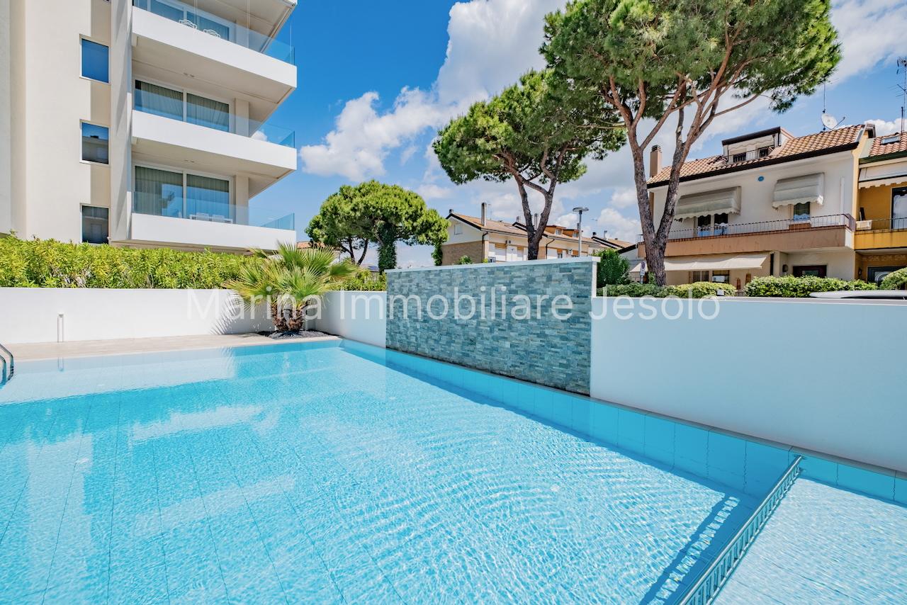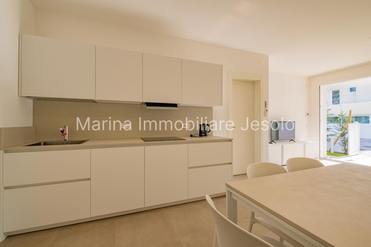 New residence with swimming pool near Aurora Square, 250 meters from the beach. Ground floor apartment with patio and private garden, consisting of: kitchenette and living room with double sofa bed, n. 1 double bedroom, n. 1 twin bedroom, n. 2 bathrooms.