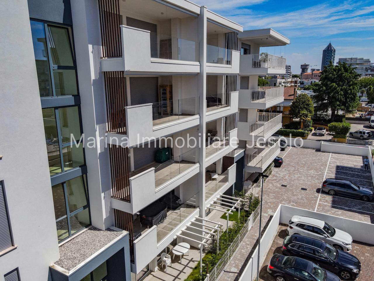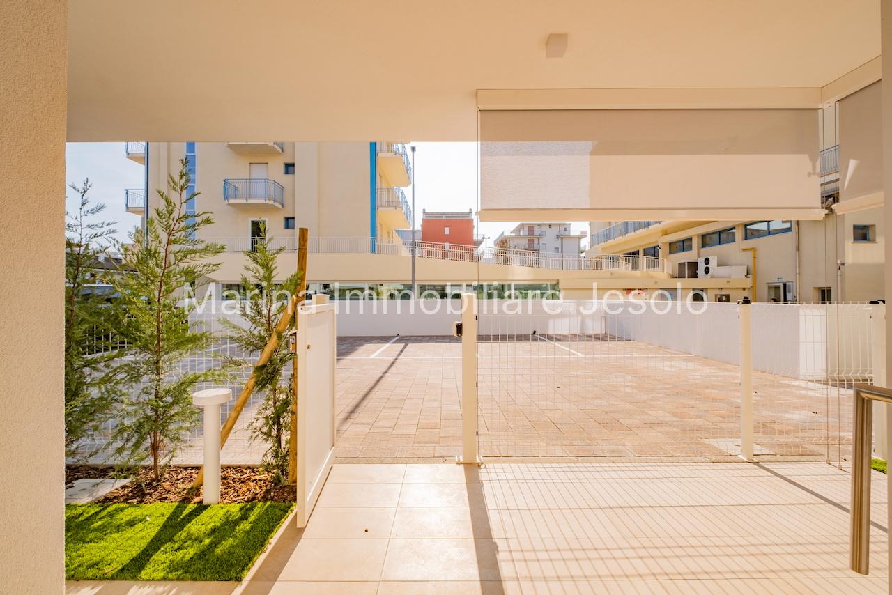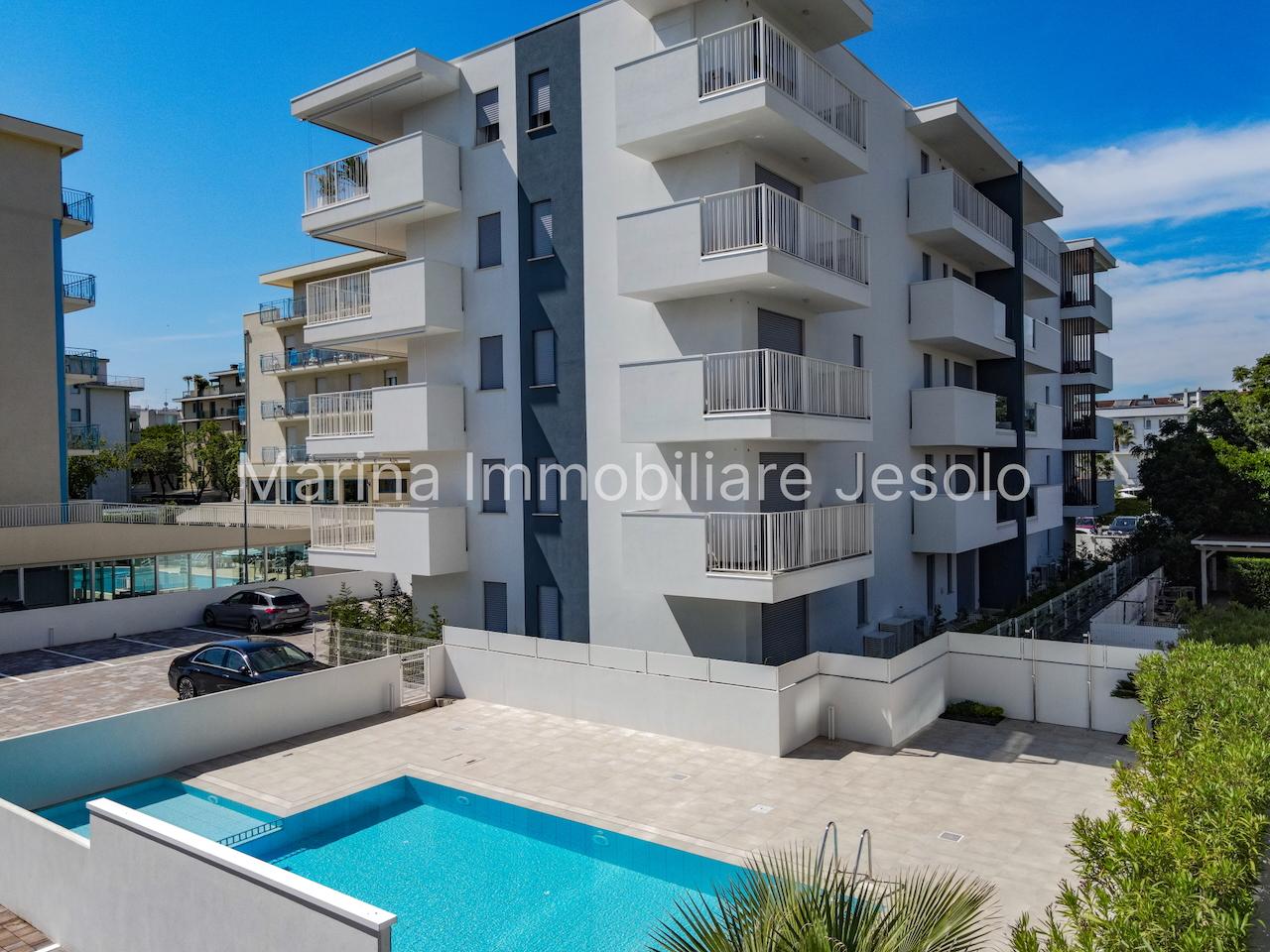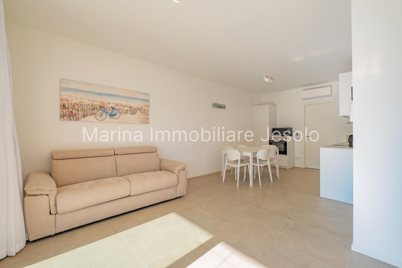 New residence with swimming pool near Aurora Square, 250 meters from the beach. Ground floor apartment with patio and private garden, consisting of: kitchenette and living room with double sofa bed, n. 1 double bedroom, n. 1 twin bedroom, n. 2 bathrooms.