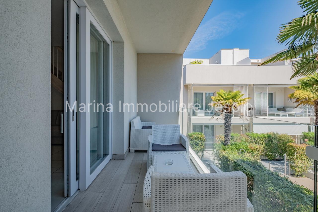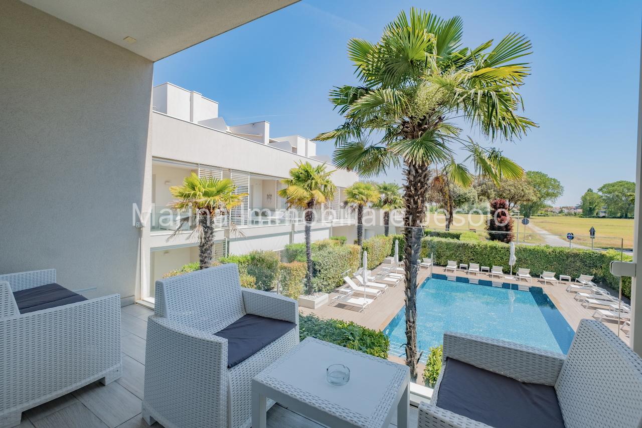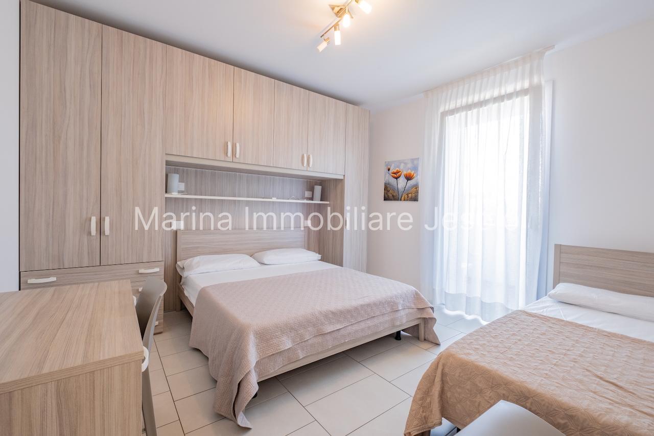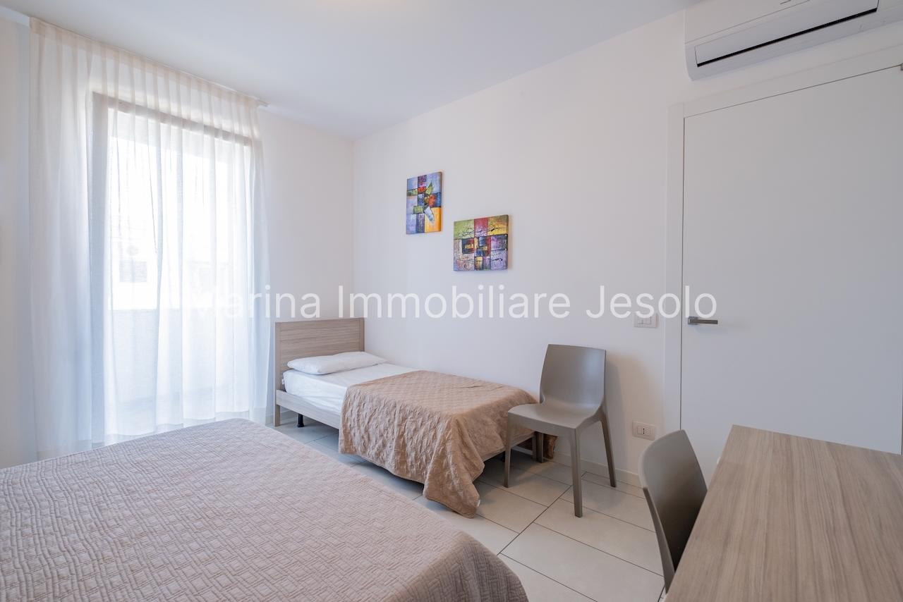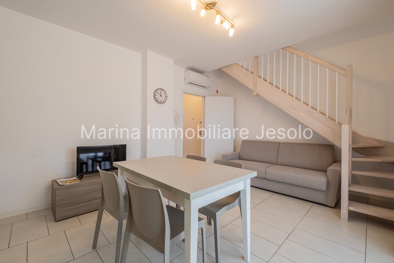 Residence with swimming pool, near Nember Square, 500 meters from the beach. Well furnished apartment, located on the 1st floor without lift, with all comforts. It is composed of: living room with double sofa bed, kitchenette, bedroom with double bed and single bed, bathroom with shower, access through an internal staircase to the upper floor where there is an equipped terrace - solarium. Washing machine, dishwasher, TV, air conditioning, WIFI. N. 1 parking place in the garage. Beach place is not included: It is possible to book a beach place at the beach consortium. Total bed places: 3+2 Rentable only to families.