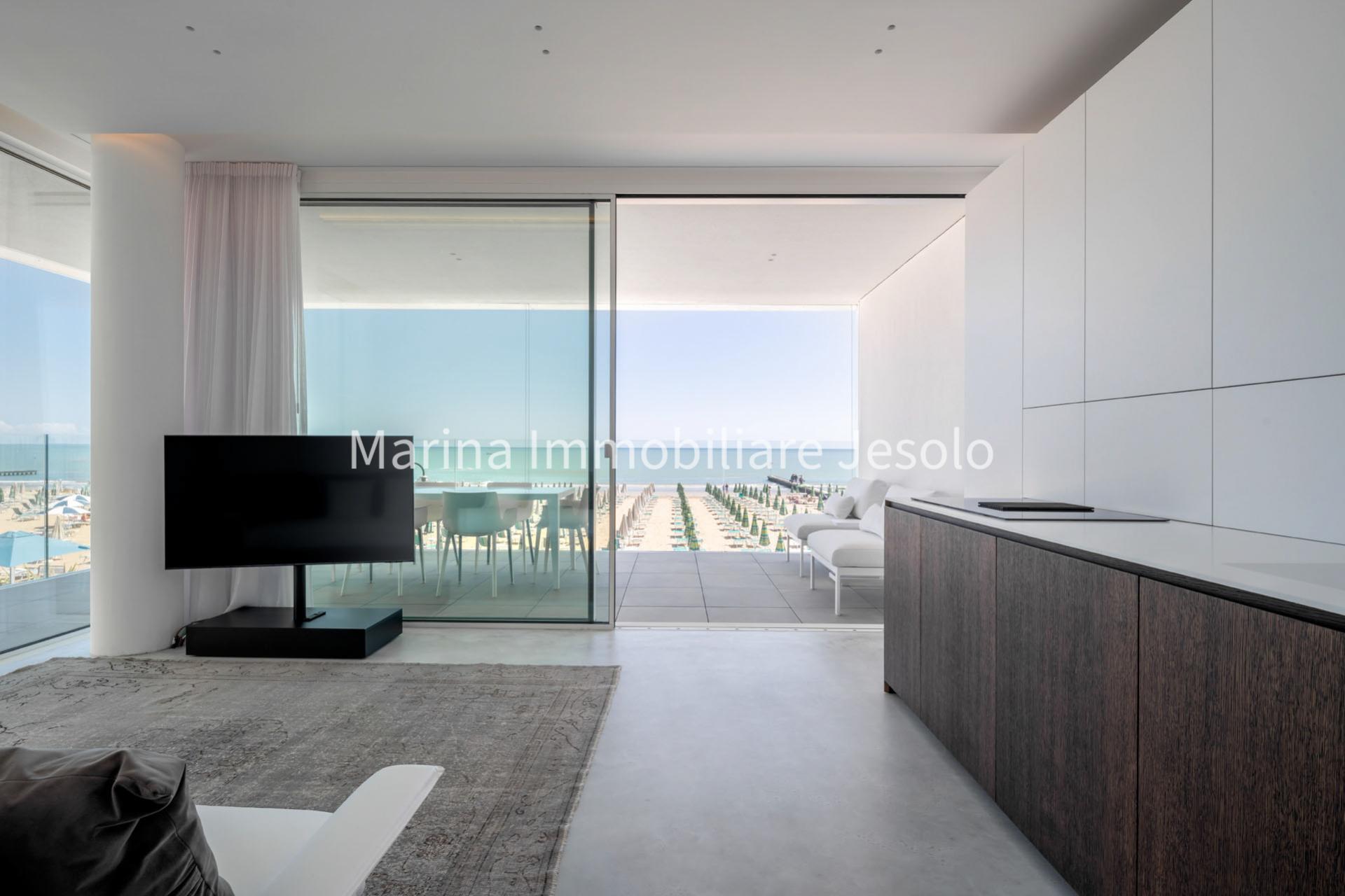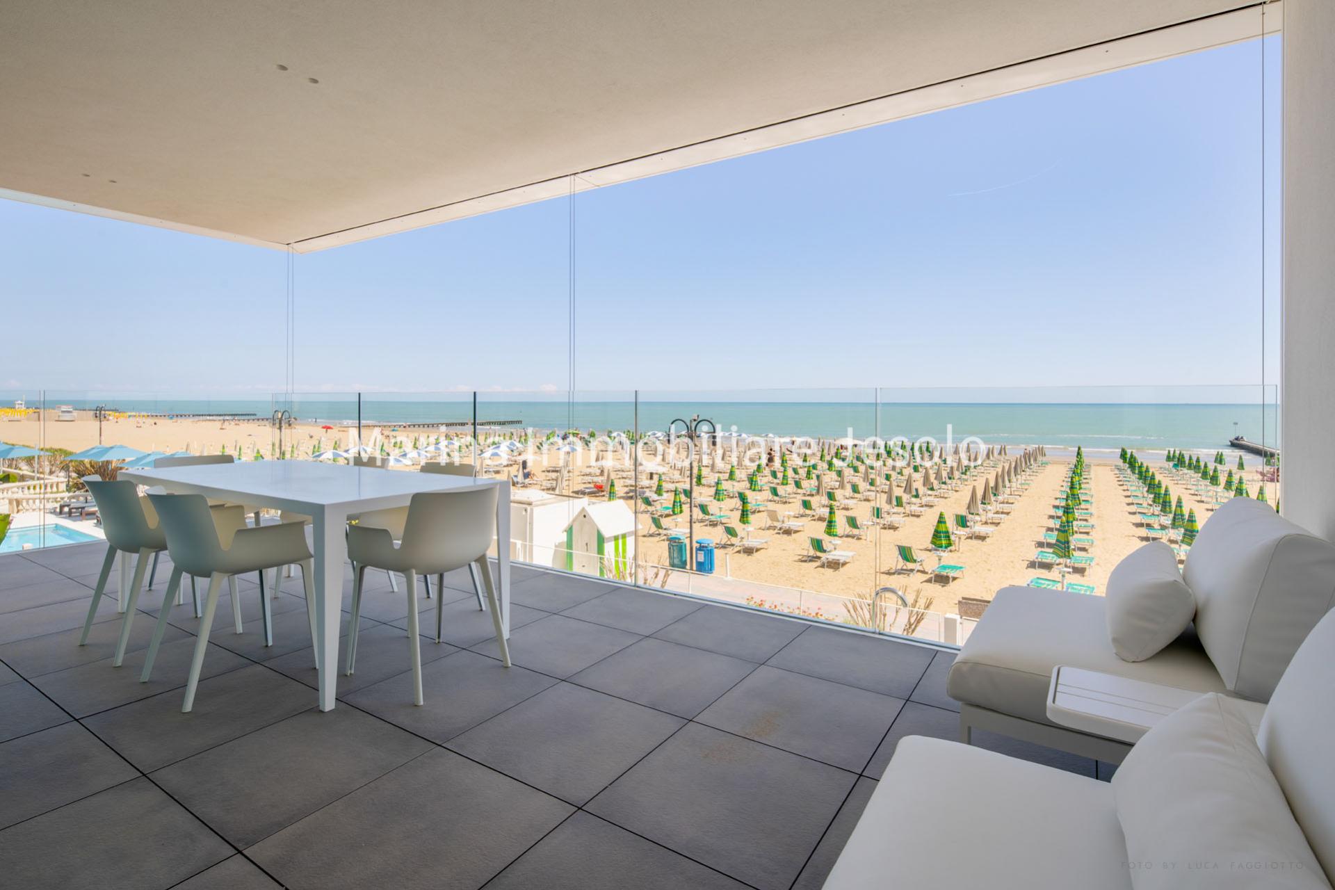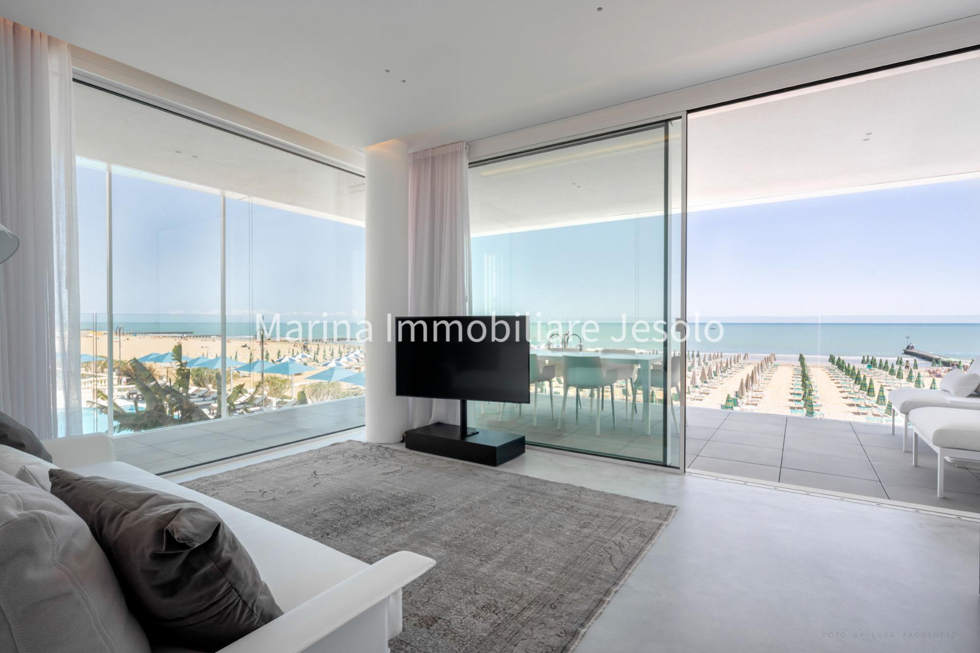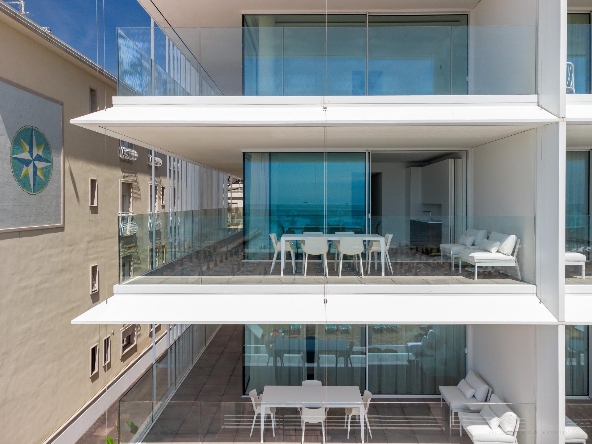 Brand new beachfront residence with swimming pool and private beach, and with modern lines. A small context, with large windows and deep terraces facing the sea. The apartment is located on the 1st floor and it is composed of: living room, kitchenette, n. 1 bedroom with double bed, n. 1 bedroom with two single beds, n. 1 bedroom with a single bed, two bathrooms, big outdoor terrace overlooking the beach. Equipped with every comfort, such as washing machine, dishwasher, TV, air conditioning, microwave, WIFI, linen service. N. 1 Parking place in the underground garage, with lift, is included. Total bed places: 5 Rentable only to families.