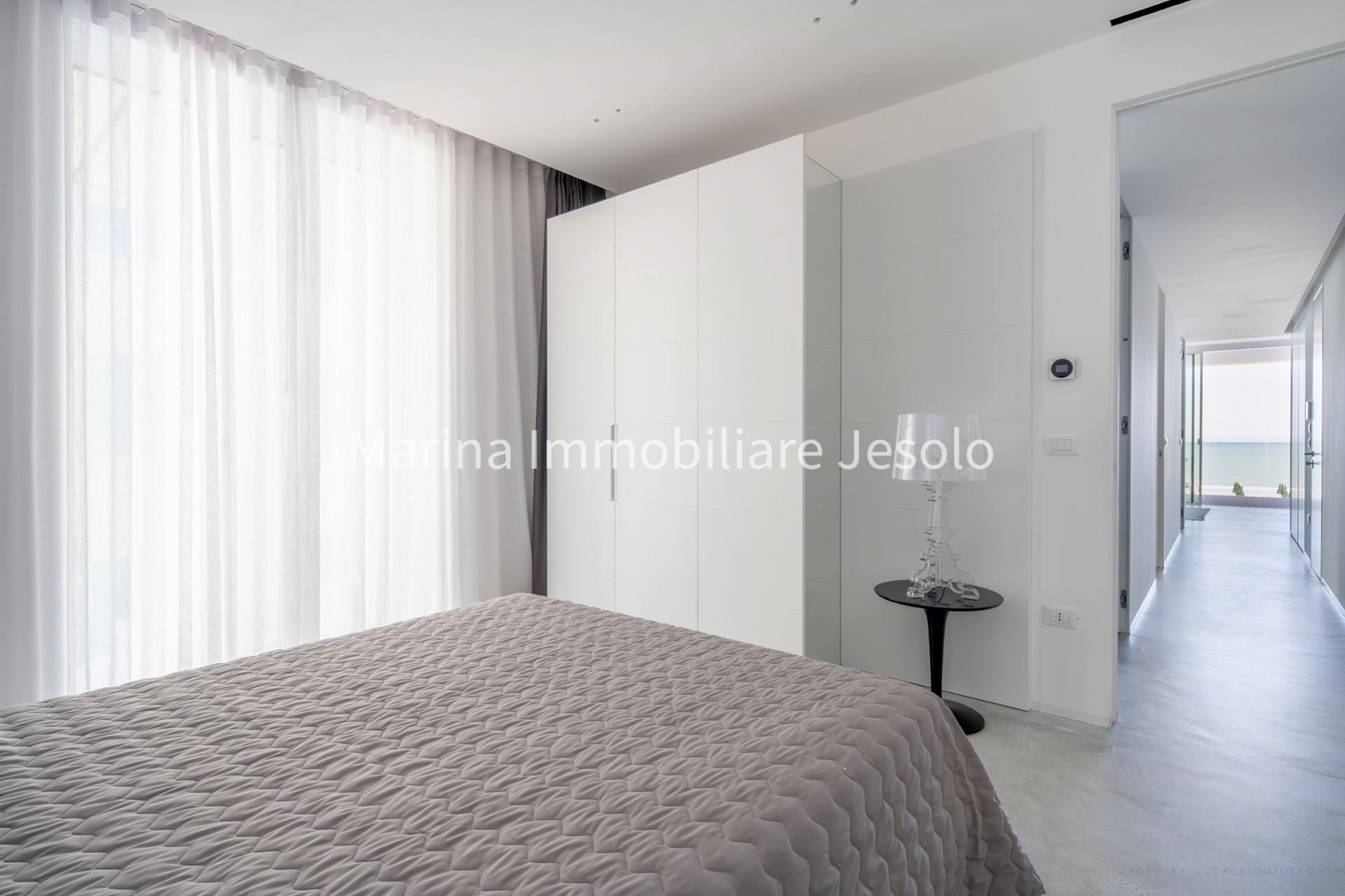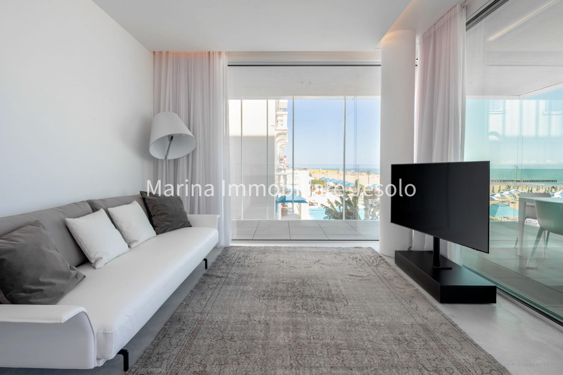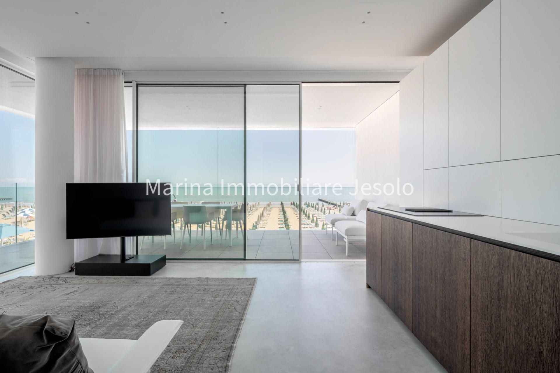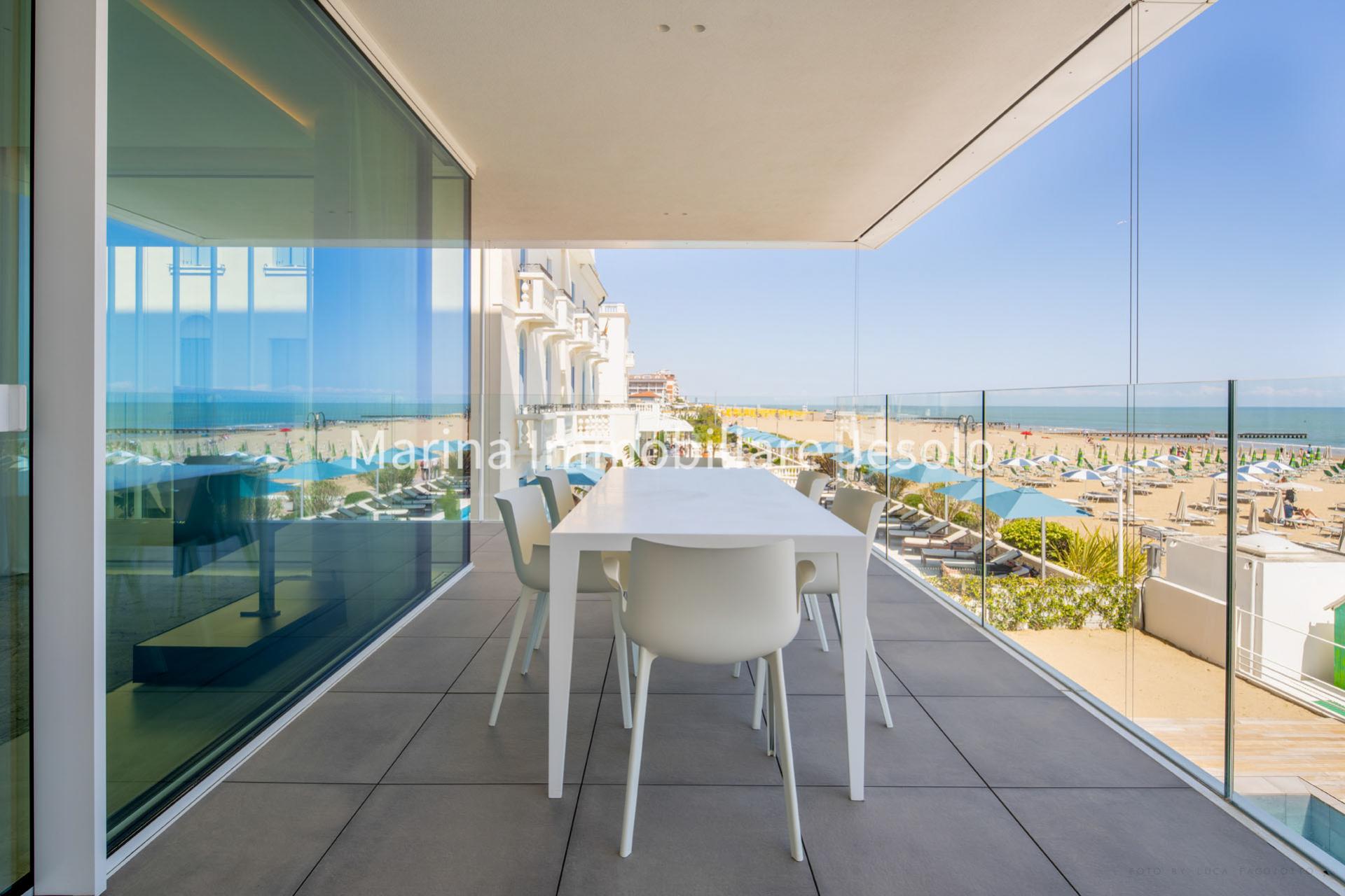 Brand new beachfront residence with swimming pool and private beach, and with modern lines. A small context, with large windows and deep terraces facing the sea. The apartment is located on the 1st floor and it is composed of: living room, kitchenette, n. 1 bedroom with double bed, n. 1 bedroom with two single beds, n. 1 bedroom with a single bed, two bathrooms, big outdoor terrace overlooking the beach. Equipped with every comfort, such as washing machine, dishwasher, TV, air conditioning, microwave, WIFI, linen service. N. 1 Parking place in the underground garage, with lift, is included. Total bed places: 5 Rentable only to families.