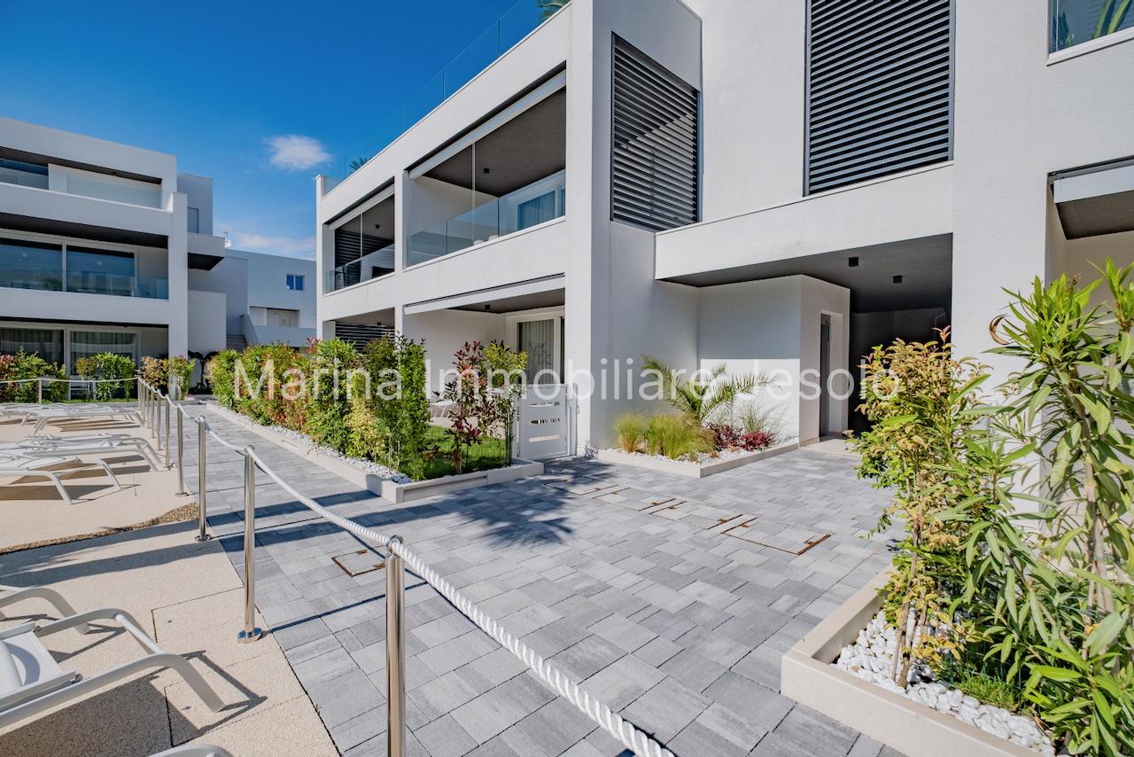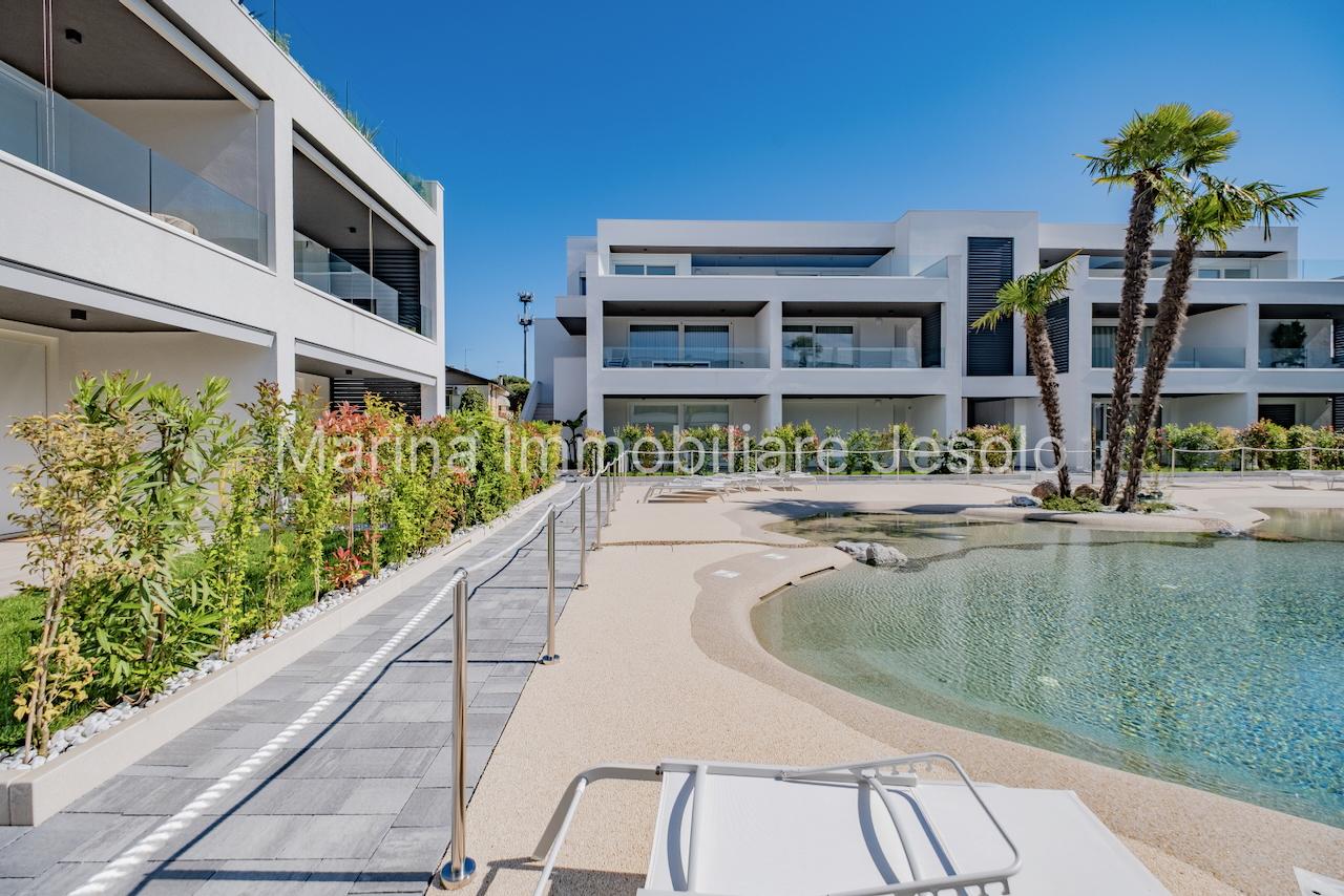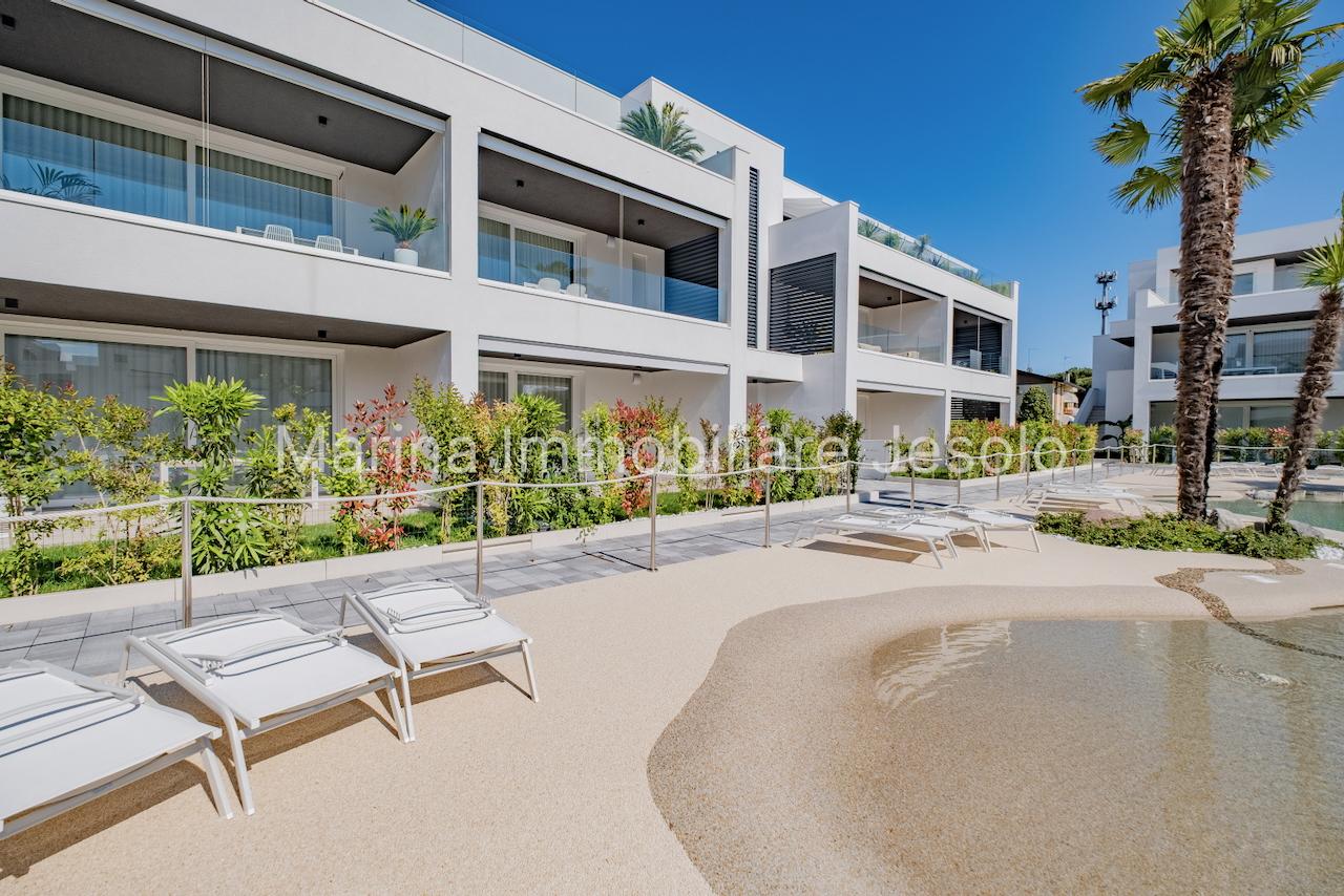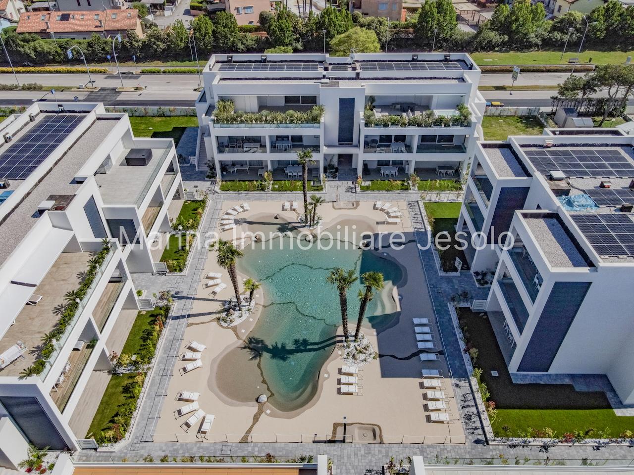 Newly built residence in central area between Piazza Aurora - Marina with swimming pool. Ground floor flat, with all comforts, as follows: kitchenette and living room, no. 1 double bedroom, no. 1 twin bedroom, no. 2 bathrooms, patio and garden, parking space. Total beds 4+2 Beach place bookable at the local consortium with fee. Not rentable to groups of children.