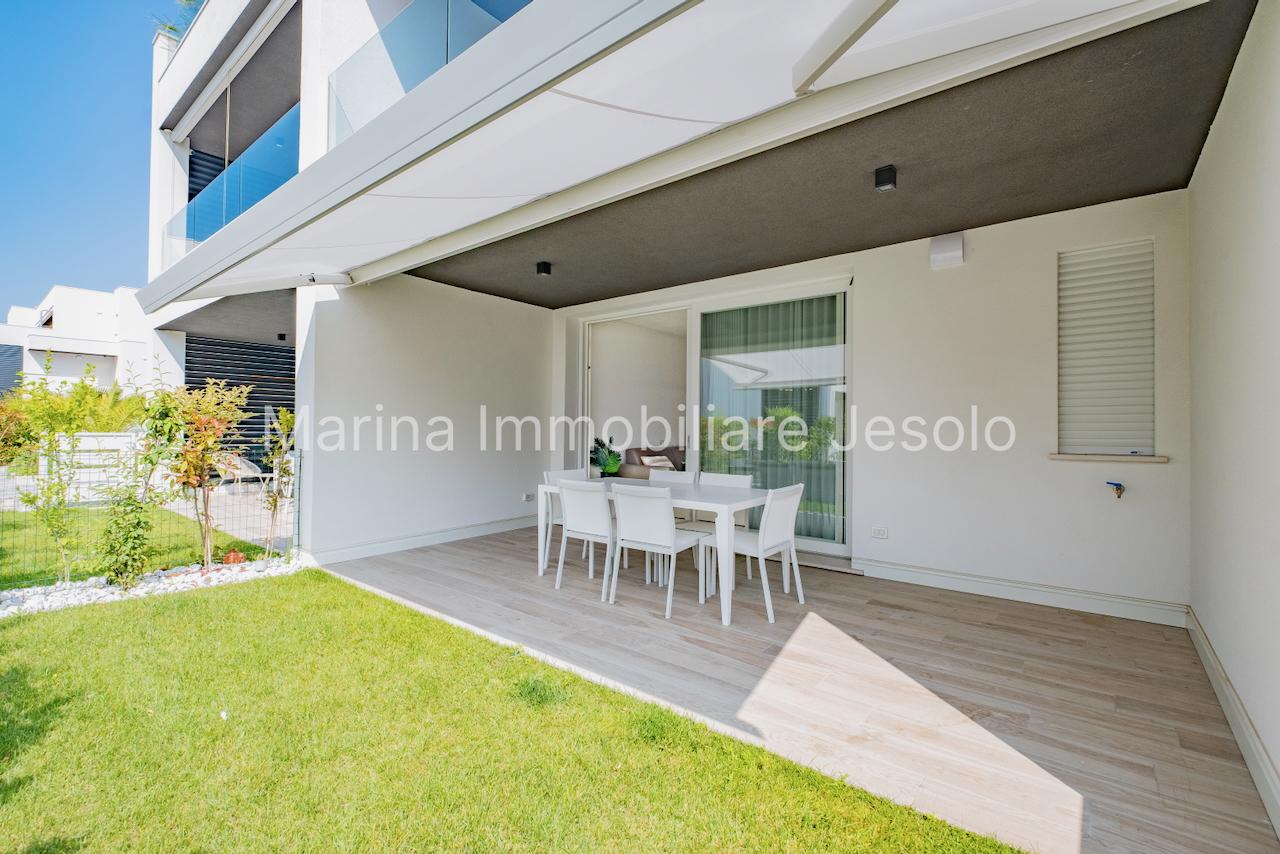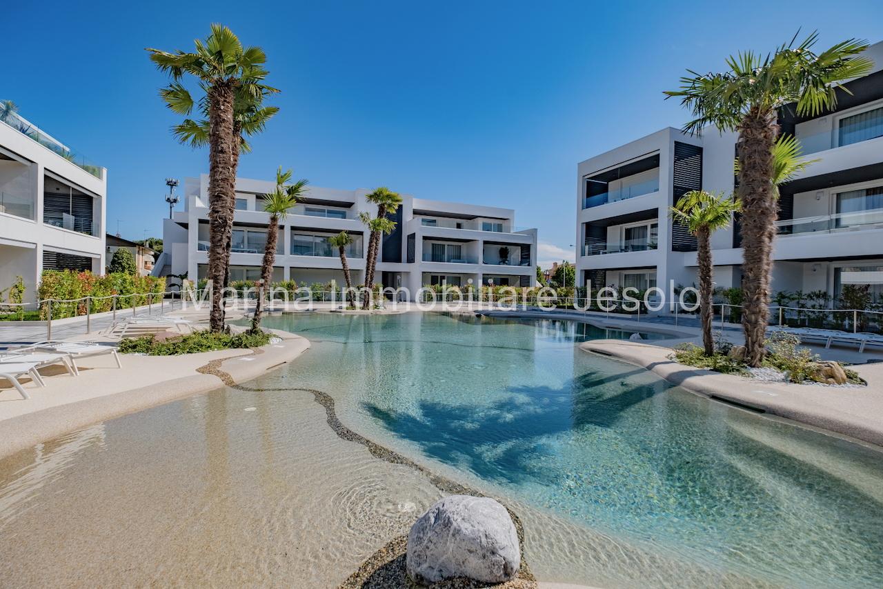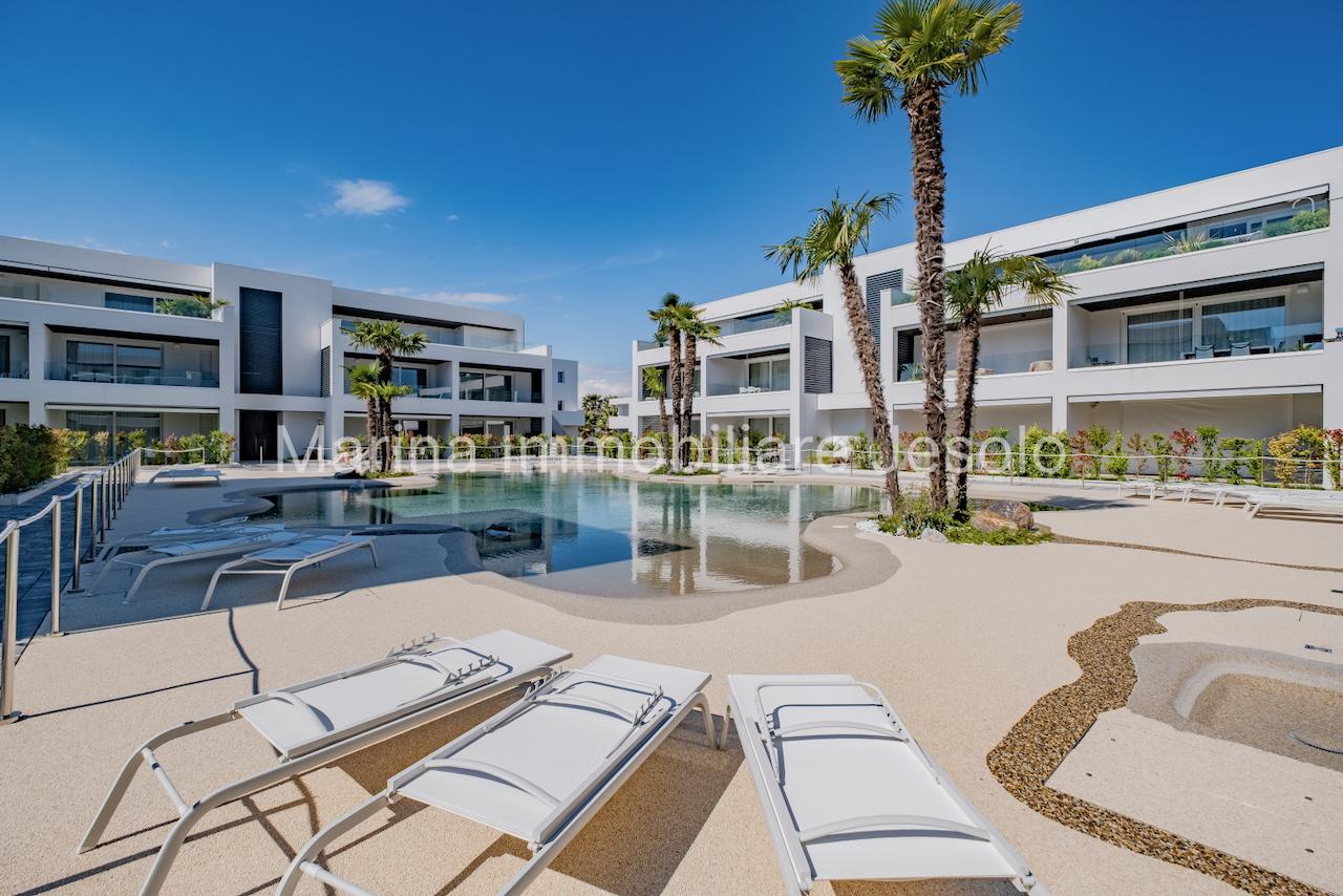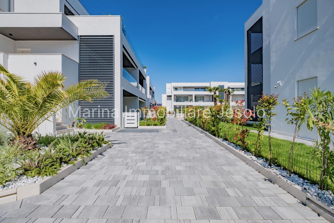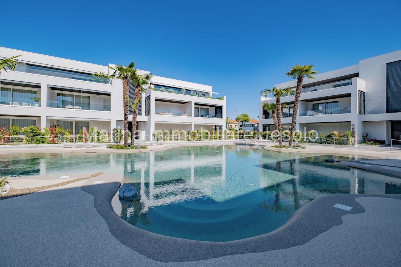Newly built residence in central area between Piazza Aurora - Marina with swimming pool. Ground floor flat, with all comforts, as follows: kitchenette and living room, no. 1 double bedroom, no. 1 twin bedroom, no. 2 bathrooms, patio and garden, parking space. Total beds 4+2 Beach place bookable at the local consortium with fee. Not rentable to groups of children.